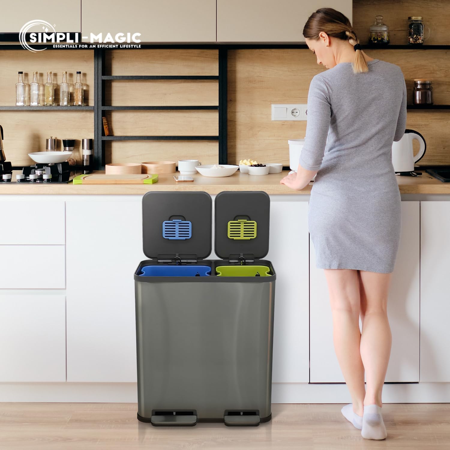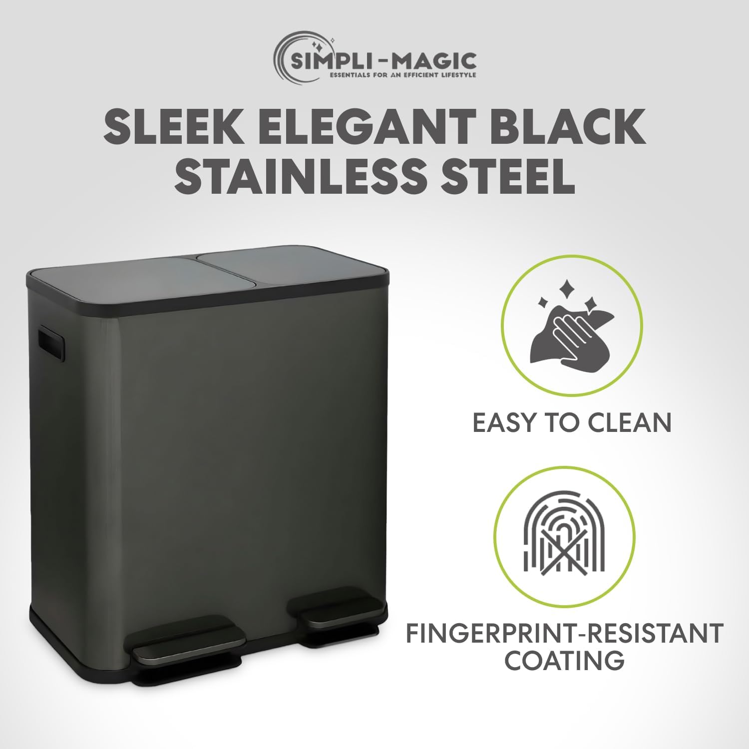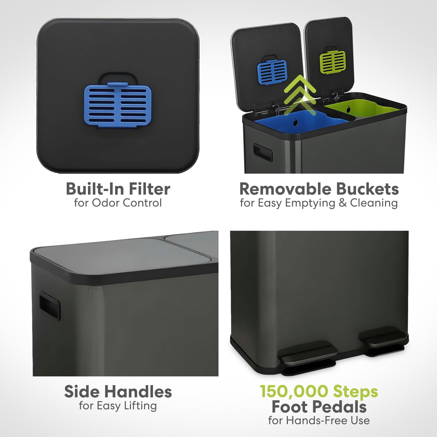 • Hands-Free Step Pedal Operation - A durable stainless steel foot pedal allows hygienic, hands-free disposal for both waste and recycling. Built for daily kitchen use, it keeps hands clean while offering smooth, reliable performance over time.