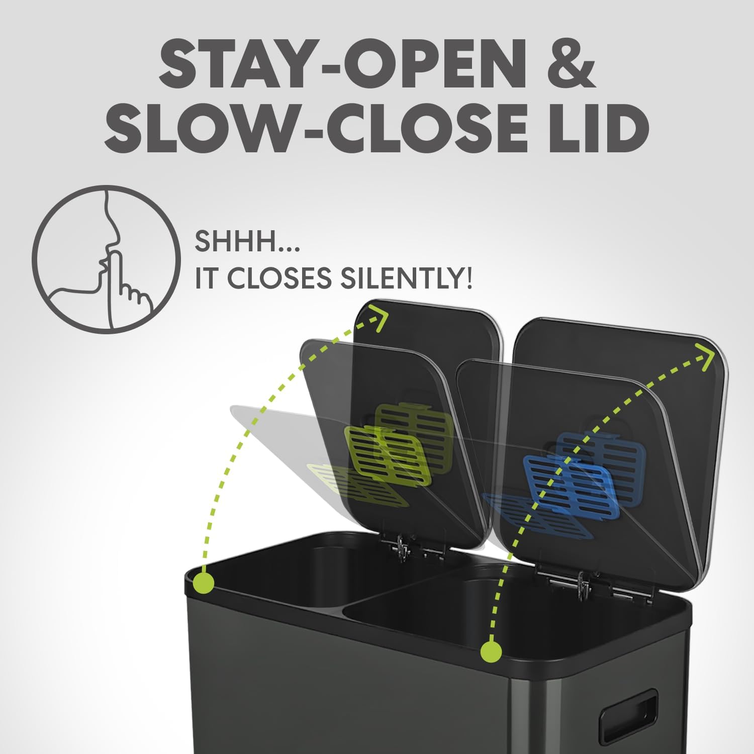 • Soft-Close Lid with Stay-Open Lock - The single lid closes slowly and quietly to reduce noise and prevent slamming. A built-in lid lock keeps the bin open for longer tasks like cooking, cleaning, or changing liners.