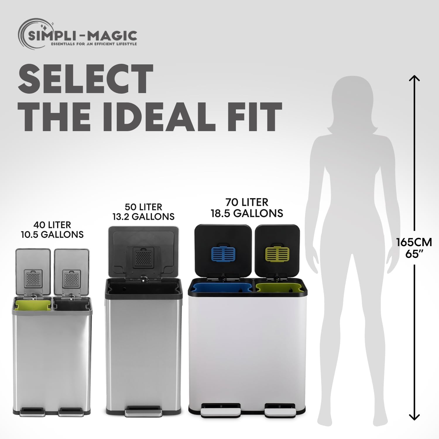 • Extra-Large Dual Compartment Capacity - Designed for efficient waste and recycling, this 70L trash can features two color-coded inner liners - 40L for trash and 30L for recycling - making sorting easy while fitting standard bags with secure bag cinches.