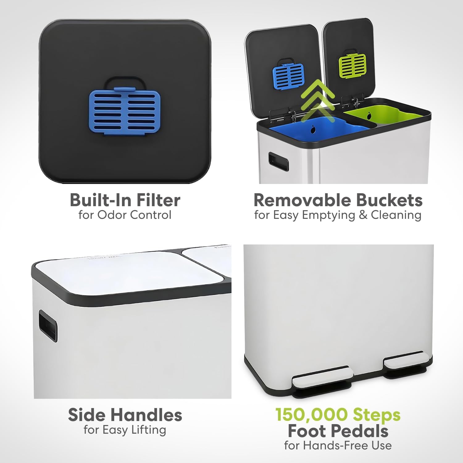 70 Liter / 18.5 Gallon Dual Compartment Recycling Trash Can – Hands-Free Kitchen Step Bin with Soft-Close Lid, Odor Filter, Stainless Steel Foot Pedal, Black Finish (40L + 30L), White