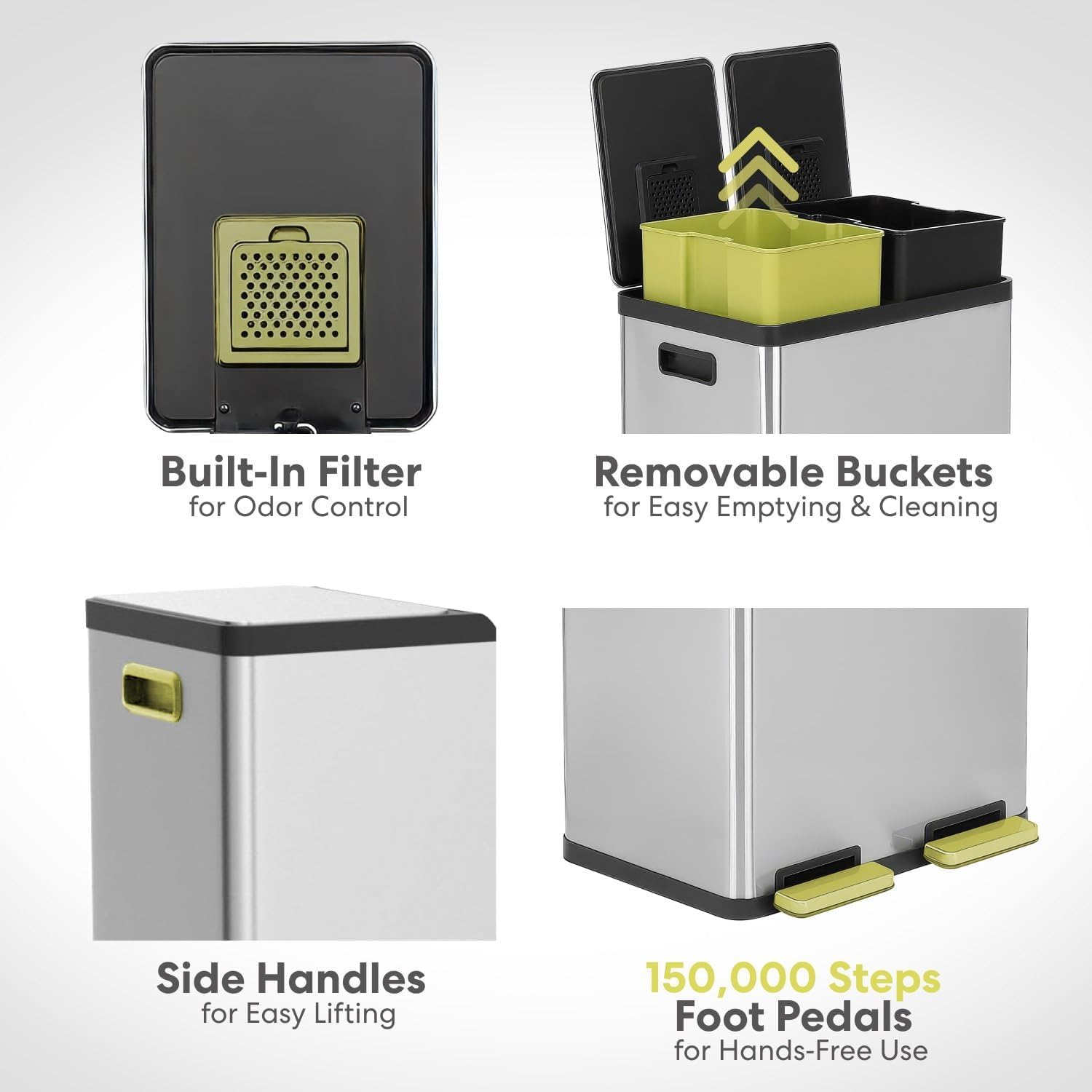 • HANDS-FREE USE: The stainless-steel foot pedal stands up to daily use and removes the need to touch the lid during waste or recycling disposal to keep hands clean.