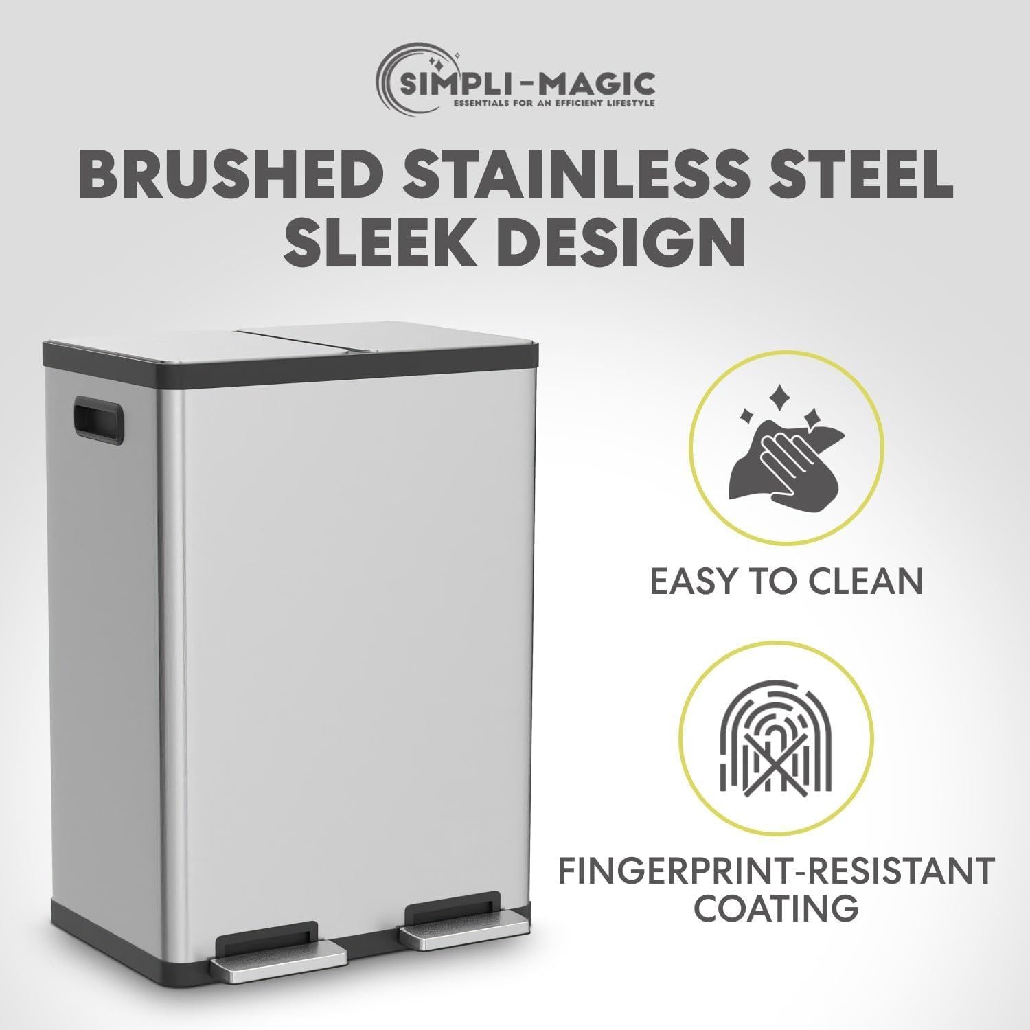 SIMPLI-MAGIC 16 Gallon (30L x 30L) Dual Compartment Step Trash Can – Kitchen Garbage Can With Slow-Close Lids – Waste & Recycling Bins, Odor Control, Hands-Free, Easy to Clean, Stainless Steel