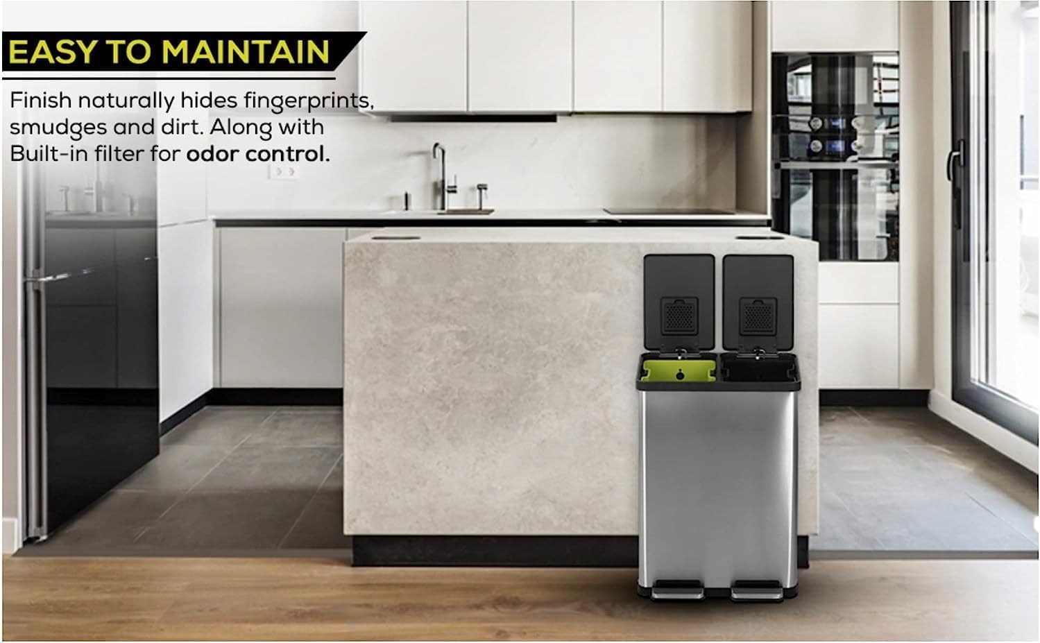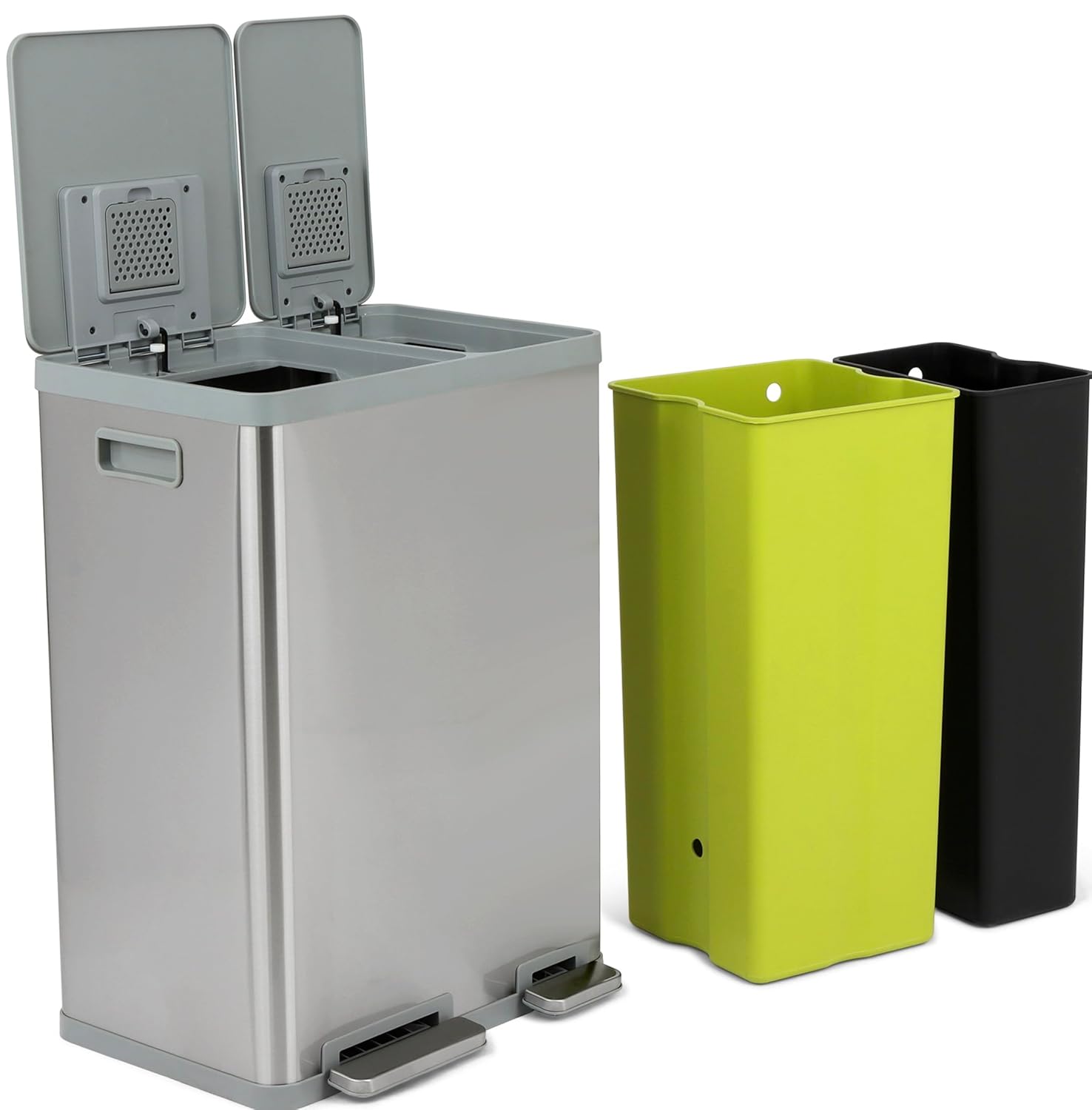 • HIGH CAPACITY WASTE AND RECYCLING SOLUTION: Color coded liners in Green (38L) and Black (22L) allow for easy sortation of waste and recycling, without sacrificing waste capacity, and fit standard liners using bag cinch.