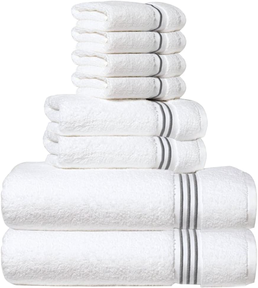 8-Piece Premium Towel Set, 2 Bath Towels, 2 Hand Towels, and 4 Wash Cloths, 100% Ring Spun Cotton Highly Absorbent Towels for Bathroom, Gym, Hotel, and Spa. PREMIUM QUALITY CONSTRUCTION- Woven with 100% ring spun cotton that are supremely soft and breathable while being strong and durable to hold up to daily use. Enjoy the luxury of wrapping yourselves in bath towels after shower, drying your hands or cleaning your face with a washcloth. MULTIPURPOSE/VERSATILE/ DYNAMIC USE- Perfect combination of softness and strength, the towel set is ideal for everyday usage. Use the towels efficiently in a bathroom, at gym, beach, poolside, salon, spa or even